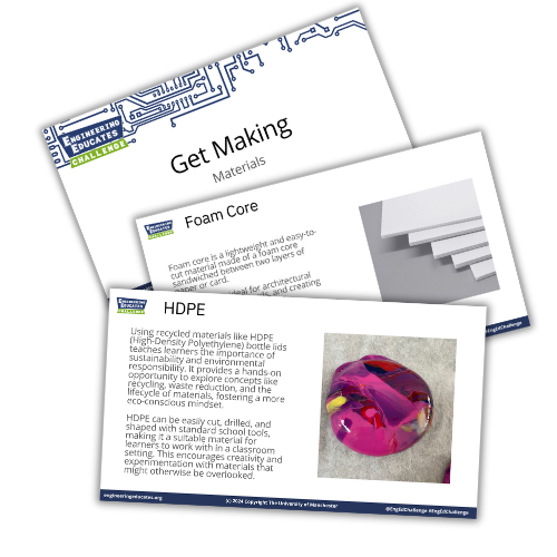 The EngEd Toolkit area of the website is devoted to teacher CPD. ‘Create as an Engineer’ features pupil facing videos, accompanying teacher notes and a comprehensive set of  ‘Get Making Guides’ to support the technical aspects of teaching design & technology. From the different types of materials and joins to the different mechanisms used in high quality makes.
