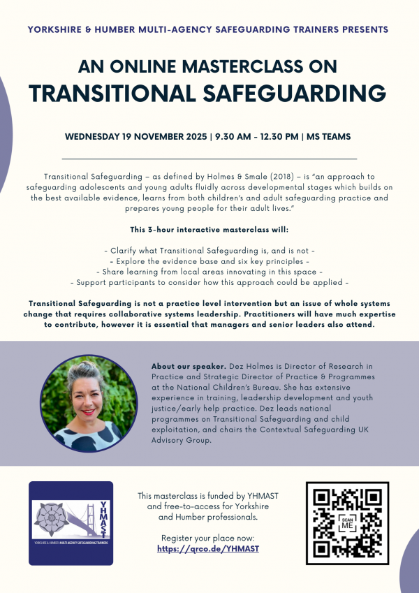 On Wednesday 19th November the Yorkshire & Humber Multi-Agency Safeguarding Trainers (YHMAST) are holding a masterclass on Transitional Safeguarding. Please see the flyer below for more details and to book a place click here.