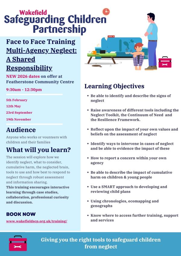 WSCP have released new dates throughout 2026 for our Multi-Agency Neglect: A Shared Responsibility Training. To find out more about this training course please see the flyer below and to book a place please click here.
