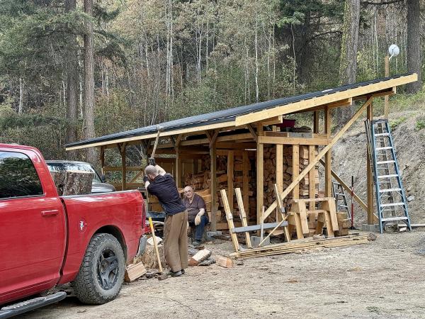We hired a local person to come up with his large excavator and dig out a significant portion of the hill beside Bodhidharma Hall. This greatly expanded the parking area and provided space for a sturdy storage shed for firewood and tools. Rev. Owyn deconstructed the old shed, which was starting to deteriorate, and he has been working on building the new shed all summer. He has also cut back much of the encroaching grass and bushes along the roads and trails. We have begun collecting firewood from the surrounding forest, then splitting and stacking it in the new shed. Much gratitude goes to Rev. Owyn for his industriousness!
