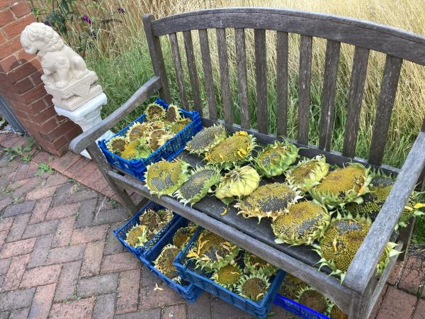 A row of sunflowers in the bottom garden provided a striking display through late summer. Their seed heads have now been collected and will be set out for the birds over the coming months.